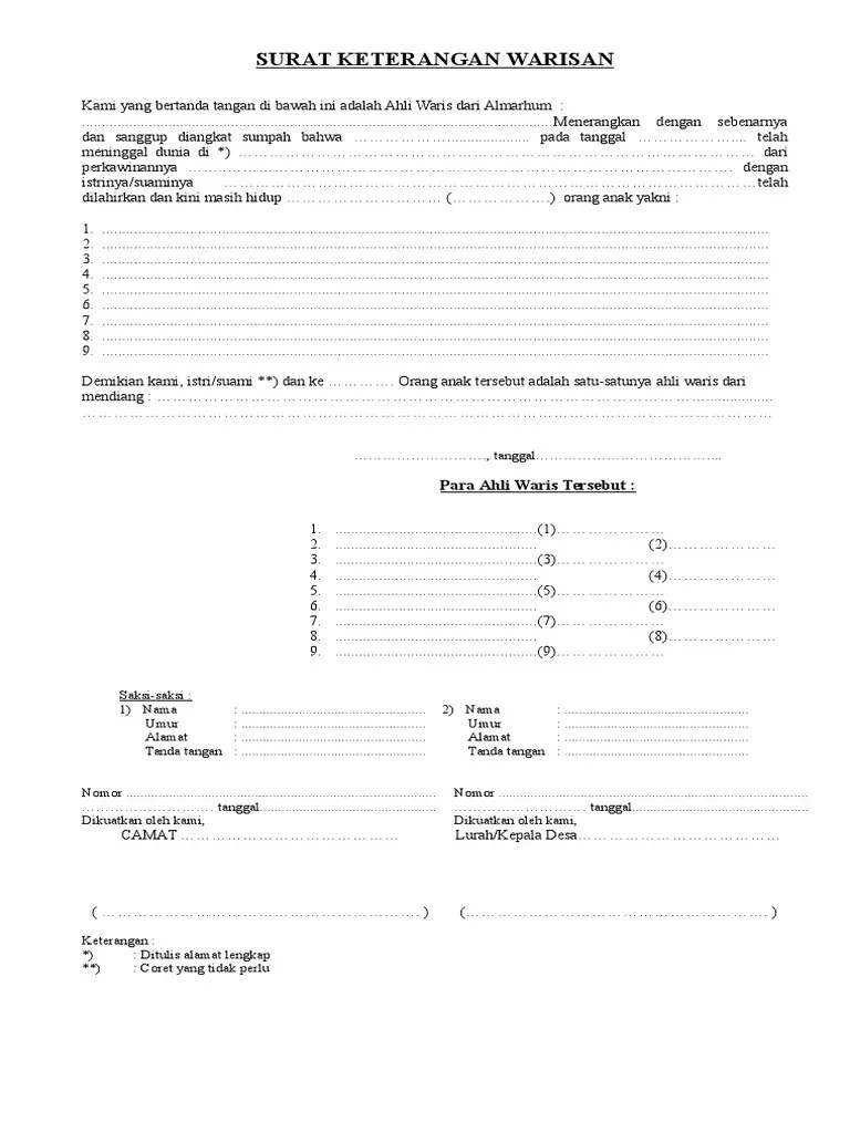 Surat ahli waris atau surat keterangan hak waris (skhw) merupakan akta. Fotokopi surat keterangan kematian pewaris dari lurah/kepala desa tempat tinggal pewaris, pada kertas ukuran a4, dimeterai 6000, lalu di cap di kantor pos. Surat keterangan ahli waris dari desa dibuat oleh para ahli waris dengan disaksikan kedua orang saksi dan dikuatkan kepala desa ataupun kelurahan bisa juga . Lurah adalah kepala kelurahan di wilayah kota. Surat pernyataan dan keterangan ahli waris.